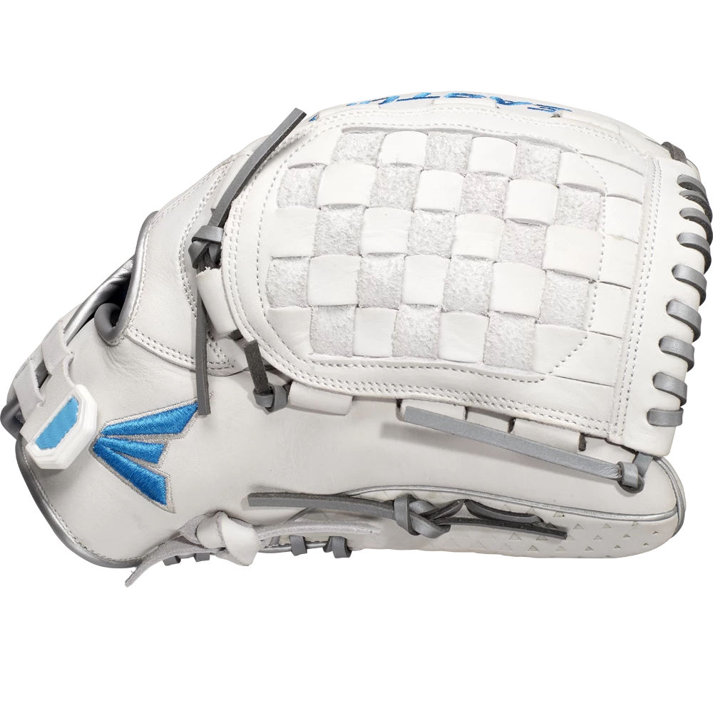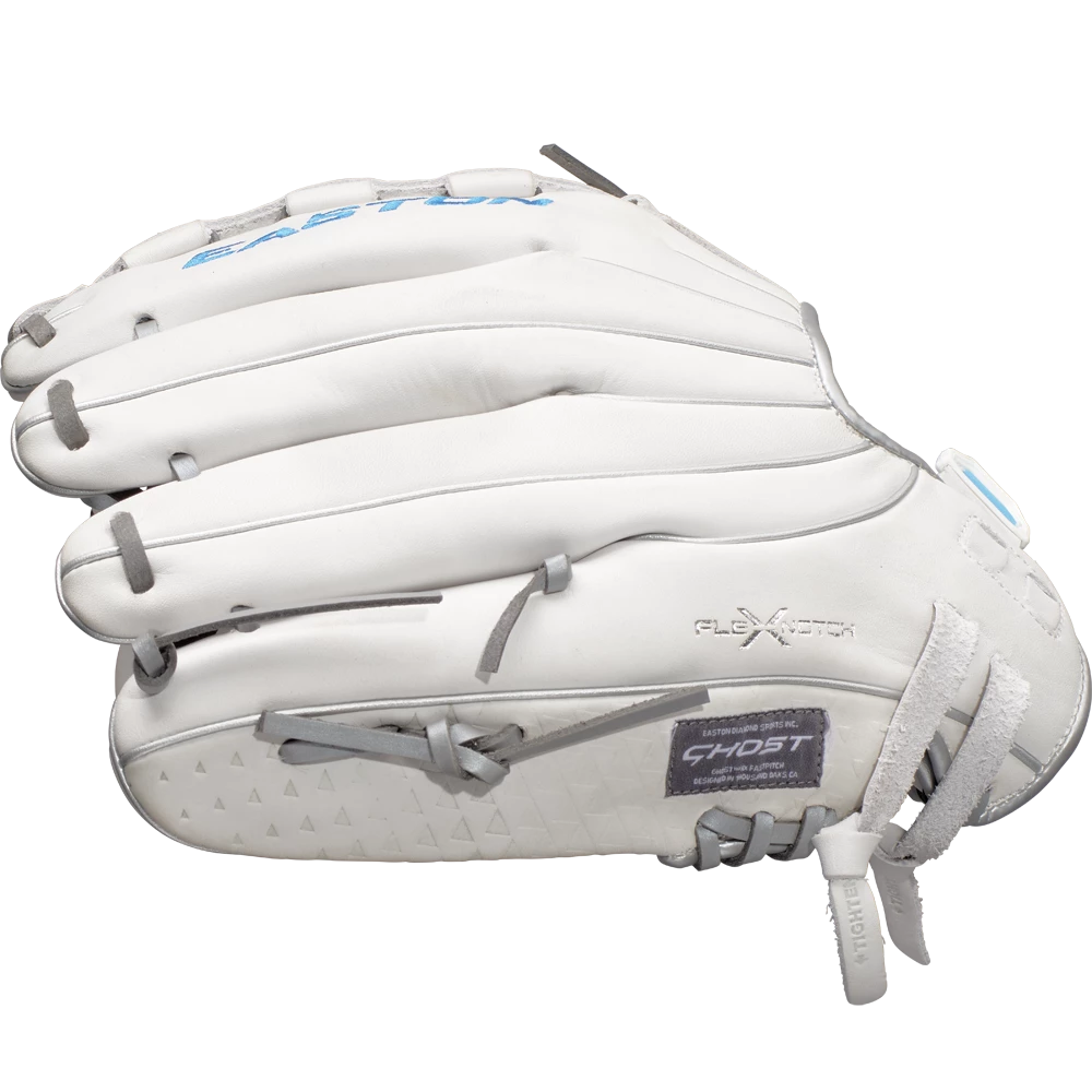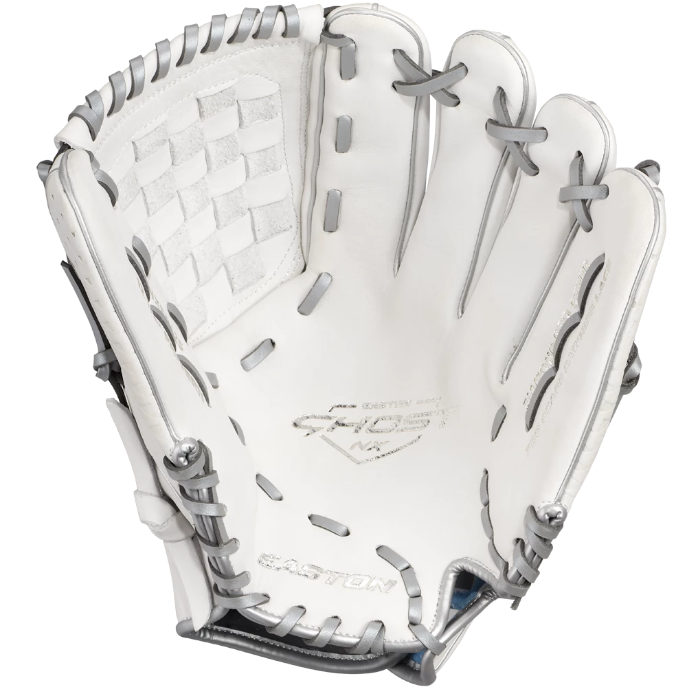 Easton’s Ghost series is a symbol of elite fastpitch play. The Ghost NX Glove fits right in. On the outside, the Game Ready Diamond Pro Steer leather and Flex Notch closure system make this glove super soft and easy to handle right away. The Quantum Closure System on the glove back ensures a perfect fit for every player, and the interior Ax Suede microfiber lining creates unmatched comfort and durability. On top of all these performance features, the striking white-and-blue colorway and professional-grade silver metallic rawhide lace are sure to turn heads.