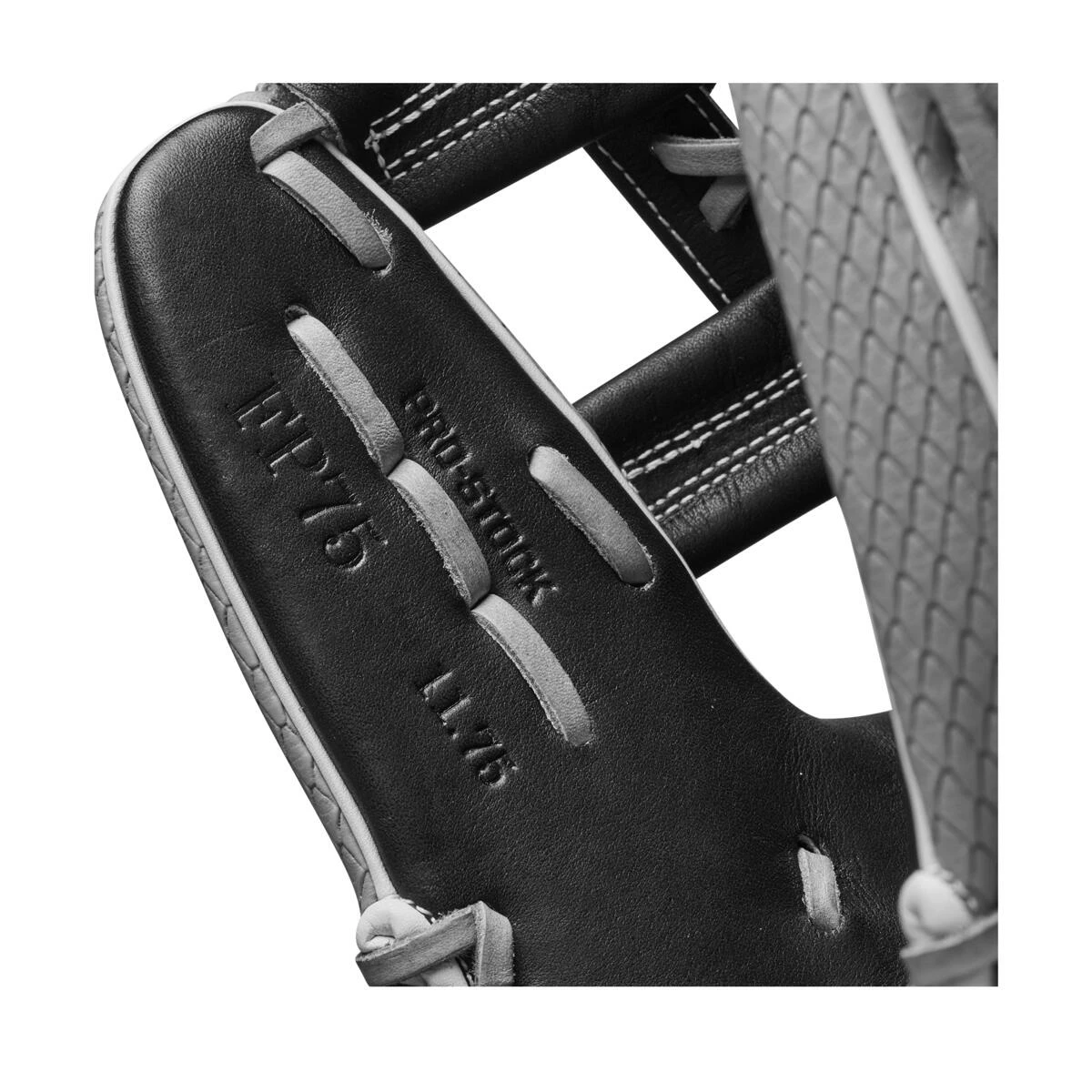 Turn two from shortstop or second base with the 2023 A2000® FP75SS fastpitch glove, the 11.75” pattern designed to help middle infielders improve command on the dirt. Gap welting between the index and middle fingers stabilize the deep pocket, and the smaller 11.75” construction empowers infielders to quickly transfer the ball for outs at any base. Gradient Bold Logos in Red and White bring a modern appearance to the A2000 FP75SS. The Black Pro Stock® leather palm offers the premium feel and durability to handle screaming line drives, and the Grey SuperSnakeSkin™ back reduces weight and repels moisture from rain or wet grass so infielders can play fast.